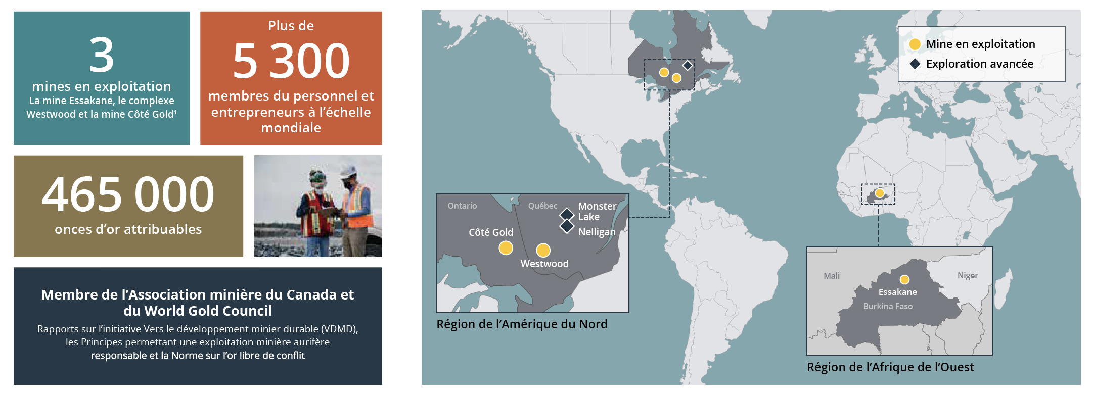 IAMGOLD est une société d’exploitation aurifère d’or de rang intermédiaire dont le siège social est situé à Toronto au Canada et qui possède des mines en exploitation en Amérique du Nord et en Afrique de l’Ouest. Le 31 mars 2024, la Société a commencé la production à grande échelle et à longue durée de vie de la mine Côté Gold en partenariat avec Sumitomo Metal Mining Co. Ltd., qui devrait être l’une des plus grandes mines d’or au Canada. Nous sommes engagés à maintenir notre culture d’exploitation minière responsable par le biais de normes élevées de pratiques environnementales, sociales et de gouvernance, y compris notre engagement envers Zéro Incident®, dans tous les aspects de nos activité